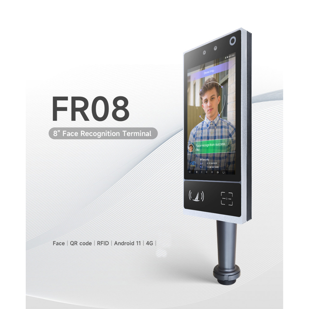 FR08 8 Inch Face Recognition System is biometric face recognition access control terminal equipment, equipped with 8 high-definition LCD screen, convenient for the use of personnel to use, Equipment can be equipped with 4G , UPS. battery, optional RFID card reading scanner, 4G, codc, for video intercom or voice intercom, etc.